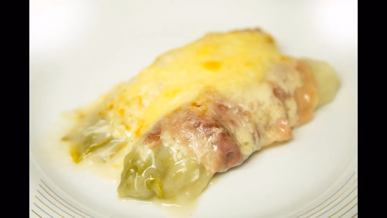 - En un recipiente para horno, coloca las endivias cocidas y cubre con la salsa bechamel y el jamón cocido cortado en trozos.
