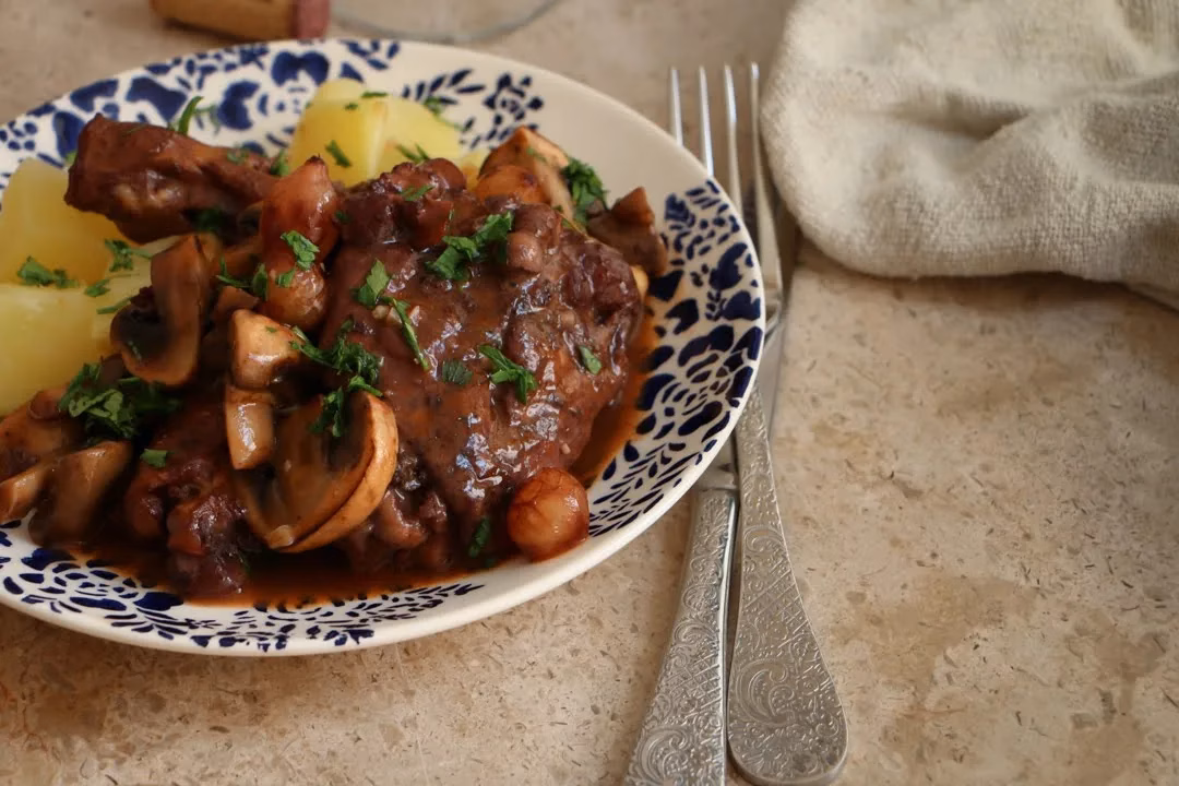 - Cubre la olla y deja que el Coq au Vin se cocine a fuego lento durante aproximadamente una hora, o hasta que el pollo esté tierno y la salsa haya espesado.