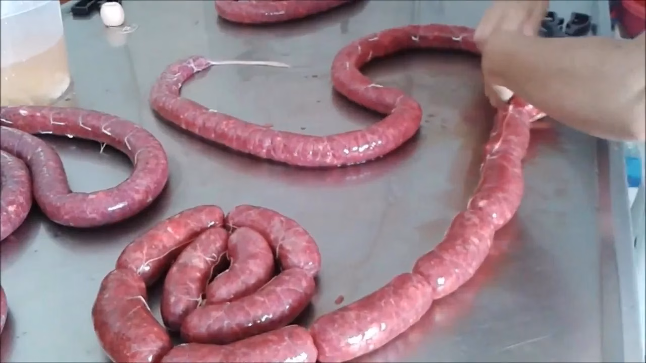 - Con la ayuda de una cuchara, rellenar tripas de cerdo con la mezcla y hacer nudos en los extremos para formar las morcillas.