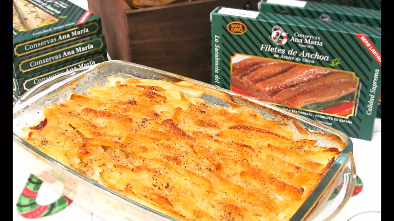 Para empezar, pela y corta las patatas en rodajas finas. Pica las cebollas en juliana y escurre las anchoas del aceite. En una sartén, derrite la mantequilla y saltea las cebollas hasta que estén transparentes. Añade las anchoas y remueve hasta que se deshagan.